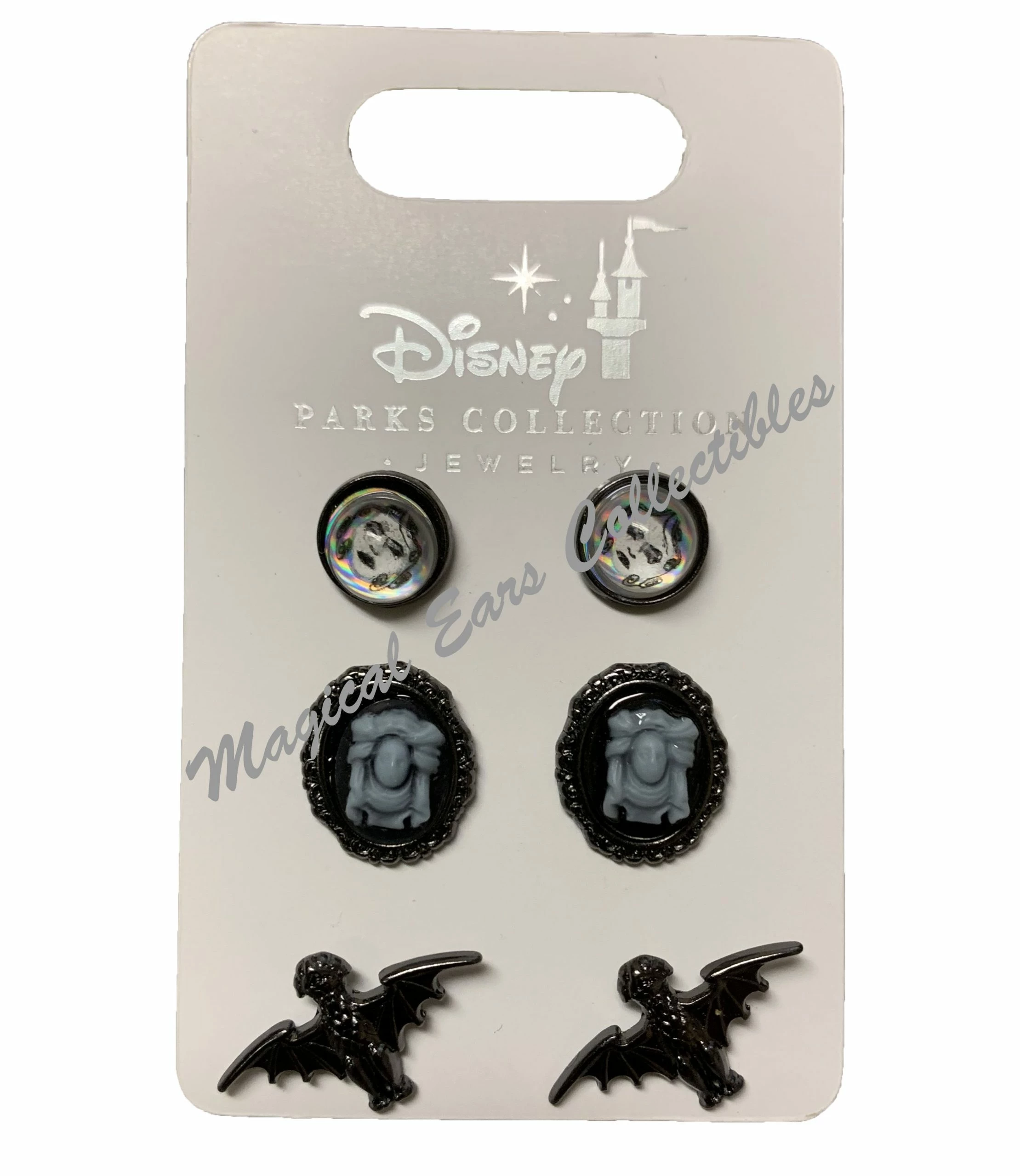 These fun Haunted Mansion Earrings are a nice added touch this Halloween or anytime of the year. Features 2 sets with Madame Leota and a set of Bats.